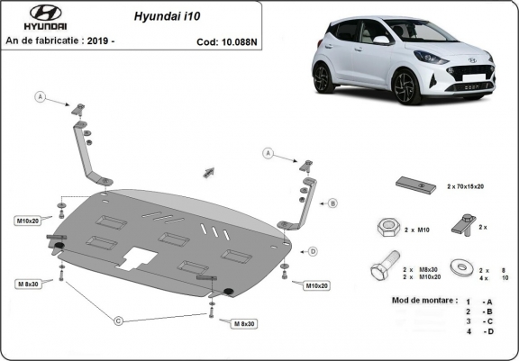 The sump guard is new and fits perfectly for all versions of Hyundai i10 manufactured between 2019 and 2026. Sump guard for the protection of the: engine, gearbox, radiator Made out of 2 mm thick Steel plate. Screws, nuts, clips, all fastening accessories are included. All sump guards are powder coated to prevent corrosion. The exterior of the sump guard is provided with Steel reinforcements, which increases the resistance to impact. |