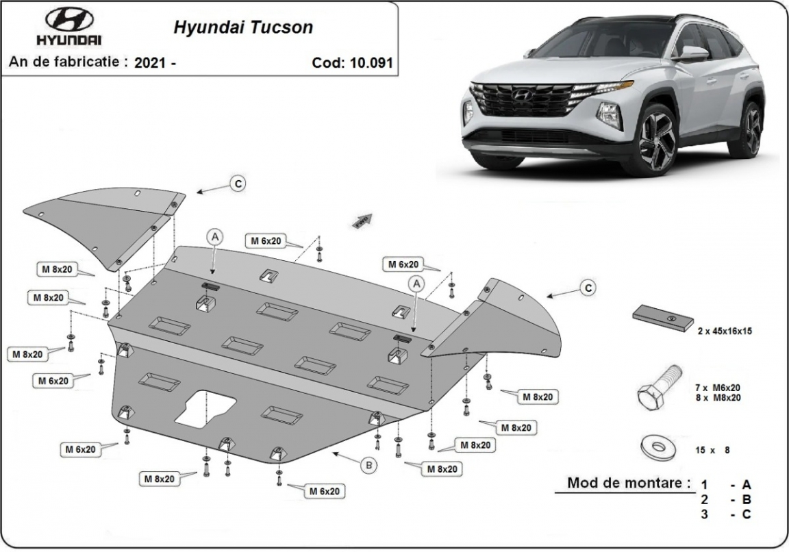 The sump guard is new and fits perfectly for all versions of Hyundai Tucson manufactured between 2021 and 2026. Sump guard for the protection of the: engine, gearbox, radiator, front bumper Made out of 2 mm thick Steel plate. Screws, nuts, clips, all fastening accessories are included. All sump guards are powder coated to prevent corrosion. The exterior of the sump guard is provided with Steel reinforcements, which increases the resistance to impact. |