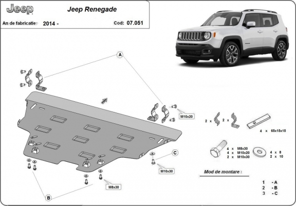 The sump guard is new and fits perfectly for all versions of Jeep Renegade manufactured between 2014 and 2026. Sump guard for the protection of the: engine, gearbox, radiator, front bumper Made out of 2 mm thick Steel plate. Screws, nuts, clips, all fastening accessories are included. All sump guards are powder coated to prevent corrosion. The exterior of the sump guard is provided with Steel reinforcements, which increases the resistance to impact. |