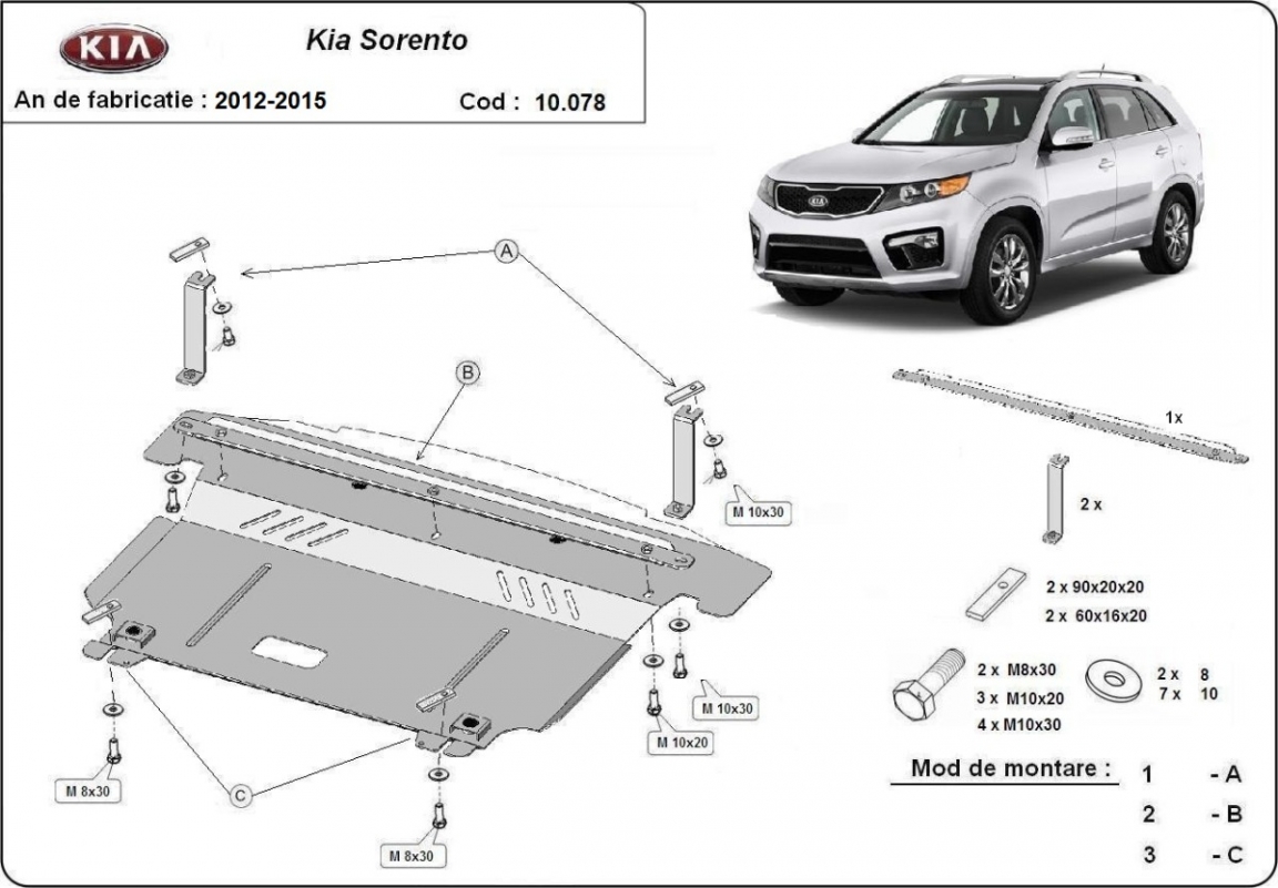 The sump guard is new and fits perfectly for all versions of Kia Sorento manufactured between 2012 and 2014. Sump guard for the protection of the: engine, gearbox Made out of 2 mm thick Steel plate. Screws, nuts, clips, all fastening accessories are included. All sump guards are powder coated to prevent corrosion. The exterior of the sump guard is provided with Steel reinforcements, which increases the resistance to impact. |