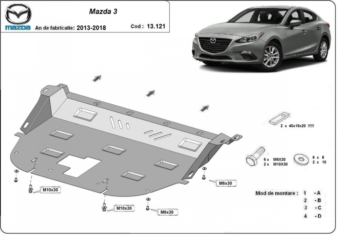 The sump guard is new and fits perfectly for all versions of Mazda 3 manufactured between 2013 and 2018. Sump guard for the protection of the: engine, gearbox, radiator Made out of 2 mm thick Steel plate. Screws, nuts, clips, all fastening accessories are included. All sump guards are powder coated to prevent corrosion. The exterior of the sump guard is provided with Steel reinforcements, which increases the resistance to impact. |