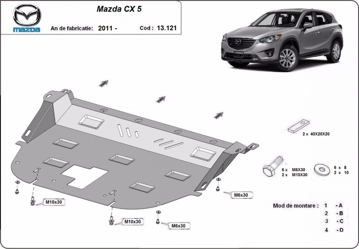 The sump guard is new and fits perfectly for all versions of Mazda CX5 manufactured between 2011 and 2026. Sump guard for the protection of the: engine, gearbox, radiator Made out of 2 mm thick Steel plate. Screws, nuts, clips, all fastening accessories are included. All sump guards are powder coated to prevent corrosion. The exterior of the sump guard is provided with Steel reinforcements, which increases the resistance to impact. |