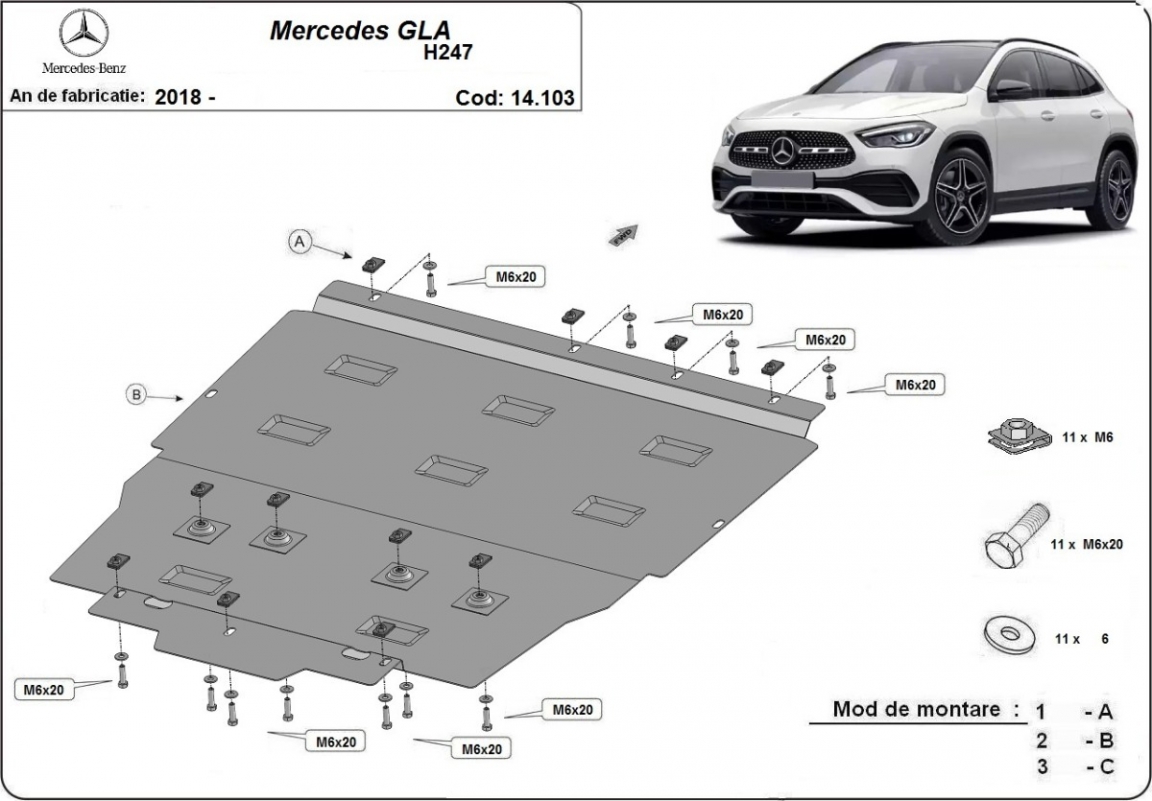 The sump guard is new and fits perfectly for all versions of Mercedes GLA H247 manufactured between 2019 and 2026. Sump guard for the protection of the: engine, gearbox, radiator Made out of 2 mm thick Steel plate. Screws, nuts, clips, all fastening accessories are included. All sump guards are powder coated to prevent corrosion. The exterior of the sump guard is provided with Steel reinforcements, which increases the resistance to impact. |