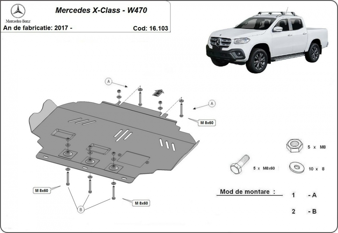 The sump guard is new and fits perfectly for all versions of Mercedes X-Class manufactured between 2017 and 2020. Sump guard for the protection of the: engine It has an opening for the oil sump, so it's removal won't be necessary to change the oil. Made out of 2.5 mm thick Steel plate. Screws, nuts, clips, all fastening accessories are included. All sump guards are powder coated to prevent corrosion. The exterior of the sump guard is provided with Steel reinforcements, which increases the resistance to impact. |
