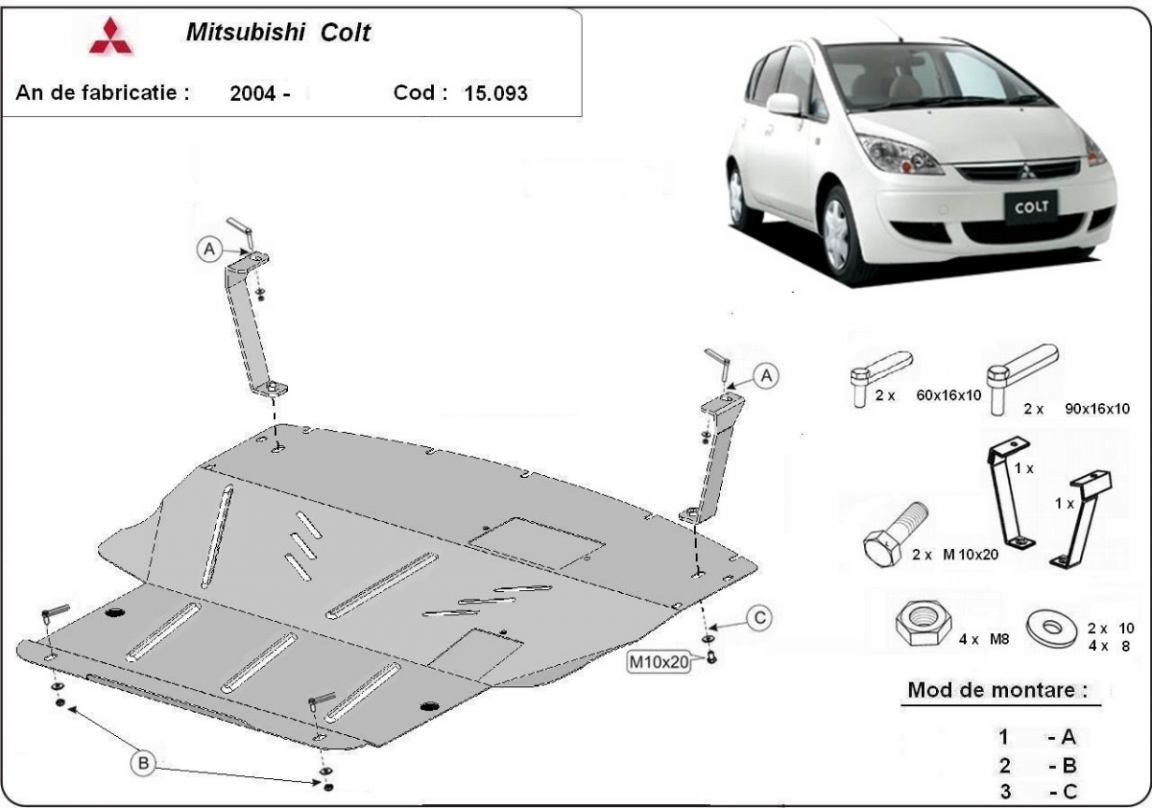 The sump guard is new and fits perfectly for the Mitsubishi Colt, with the following engine/drive versions: 1.3, 1.6 - manufactured between 2002 and 2013. Sump guard for the protection of the: engine, gearbox, radiator, front bumper It has an opening for the oil sump, so it's removal won't be necessary to change the oil. Made out of 2 mm thick Steel plate. Screws, nuts, clips, all fastening accessories are included. All sump guards are powder coated to prevent corrosion. The exterior of the sump guard is provided with Steel reinforcements, which increases the resistance to impact. |