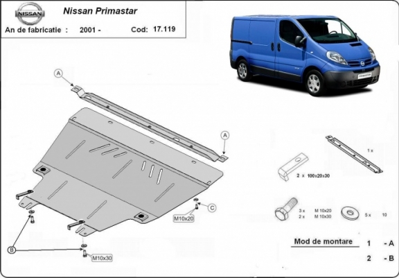 The sump guard is new and fits perfectly for all versions of Nissan Primastar manufactured between 2001 and 2015. Sump guard for the protection of the: engine, gearbox, radiator Made out of 2 mm thick Steel plate. Screws, nuts, clips, all fastening accessories are included. All sump guards are powder coated to prevent corrosion. The exterior of the sump guard is provided with Steel reinforcements, which increases the resistance to impact. |