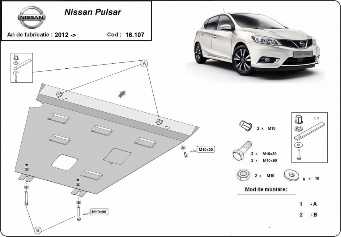 The sump guard is new and fits perfectly for all versions of Nissan Pulsar manufactured between 2012 and 2018. Sump guard for the protection of the: engine, gearbox It has an opening for the oil sump, so it's removal won't be necessary to change the oil. Made out of 2 mm thick Steel plate. Screws, nuts, clips, all fastening accessories are included. All sump guards are powder coated to prevent corrosion. The exterior of the sump guard is provided with Steel reinforcements, which increases the resistance to impact. |