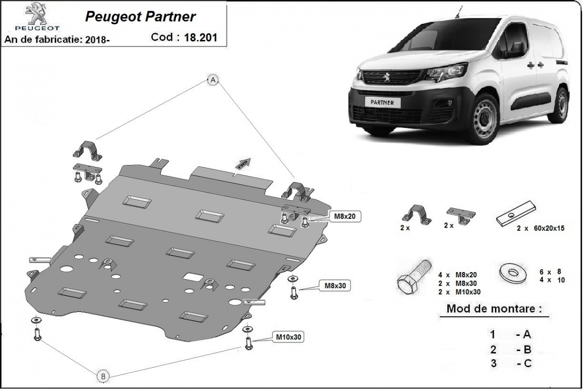 The sump guard is new and fits perfectly for all versions of Peugeot Partner manufactured between 2018 and 2026. Sump guard for the protection of the: engine, gearbox, radiator, front bumper Made out of 2 mm thick Steel plate. Screws, nuts, clips, all fastening accessories are included. All sump guards are powder coated to prevent corrosion. The exterior of the sump guard is provided with Steel reinforcements, which increases the resistance to impact. |