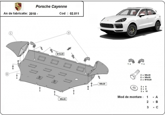 The sump guard is new and fits perfectly for all versions of Porsche Cayenne manufactured between 2018 and 2026. Sump guard for the protection of the: engine, radiator, front bumper Made out of 2 mm thick Steel plate. Screws, nuts, clips, all fastening accessories are included. All sump guards are powder coated to prevent corrosion. The exterior of the sump guard is provided with Steel reinforcements, which increases the resistance to impact. |
