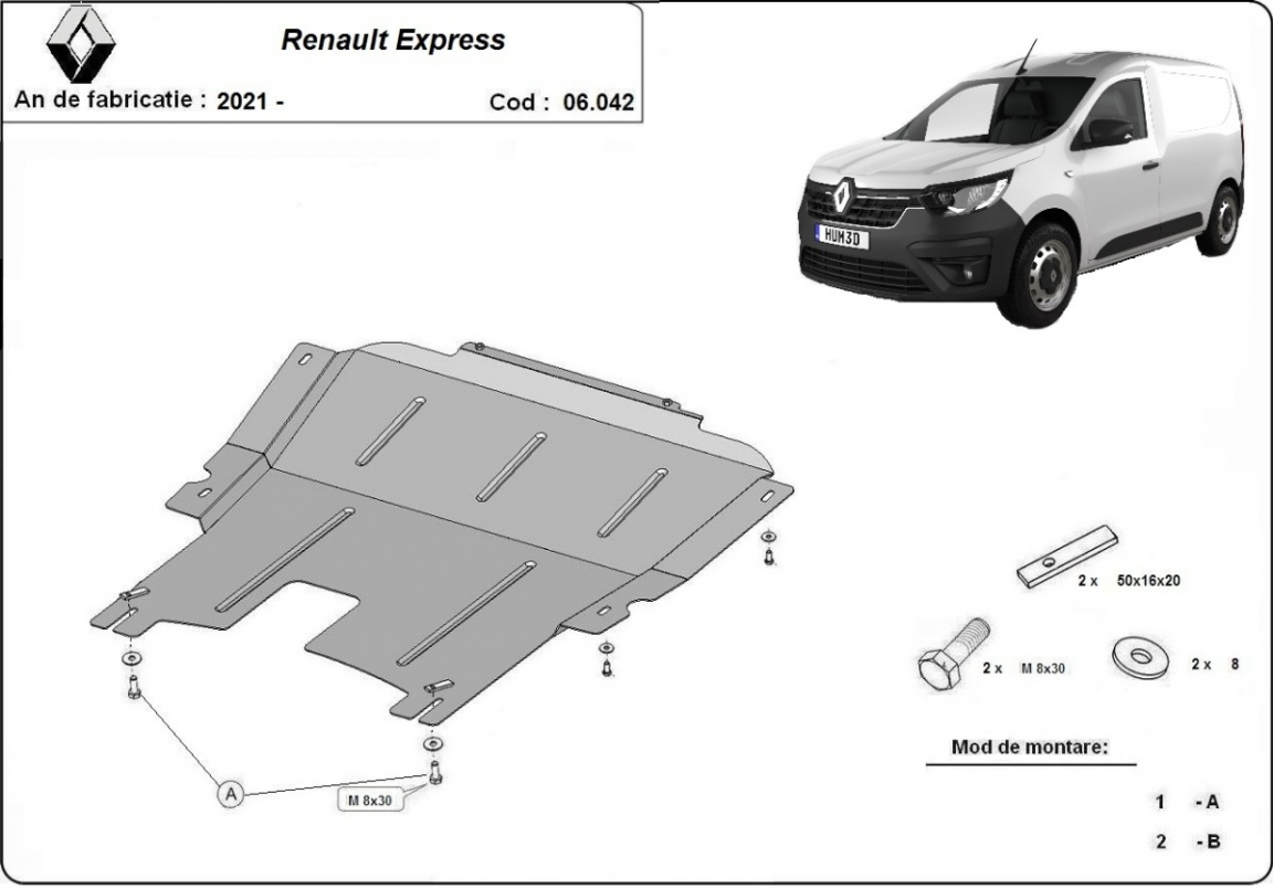 The sump guard is new and fits perfectly for all versions of Renault Express manufactured between 2021 and 2026. Sump guard for the protection of the: engine, gearbox, radiator Made out of 2 mm thick Steel plate. Screws, nuts, clips, all fastening accessories are included. All sump guards are powder coated to prevent corrosion. The exterior of the sump guard is provided with Steel reinforcements, which increases the resistance to impact. |