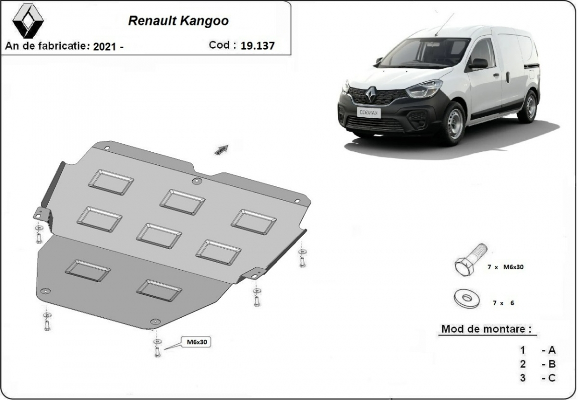 The sump guard is new and fits perfectly for all versions of Renault Kangoo manufactured between 2021 and 2026. Sump guard for the protection of the: engine, gearbox Made out of 2 mm thick Steel plate. Screws, nuts, clips, all fastening accessories are included. All sump guards are powder coated to prevent corrosion. The exterior of the sump guard is provided with Steel reinforcements, which increases the resistance to impact. |