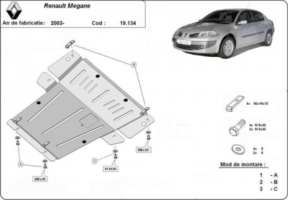 The sump guard is new and fits perfectly for all versions of Renault Megane 2 manufactured between 2004 and 2008. Sump guard for the protection of the: engine, gearbox, radiator It has an opening for the oil sump, so it's removal won't be necessary to change the oil. Made out of 2 mm thick Steel plate. Screws, nuts, clips, all fastening accessories are included. All sump guards are powder coated to prevent corrosion. The exterior of the sump guard is provided with Steel reinforcements, which increases the resistance to impact. |