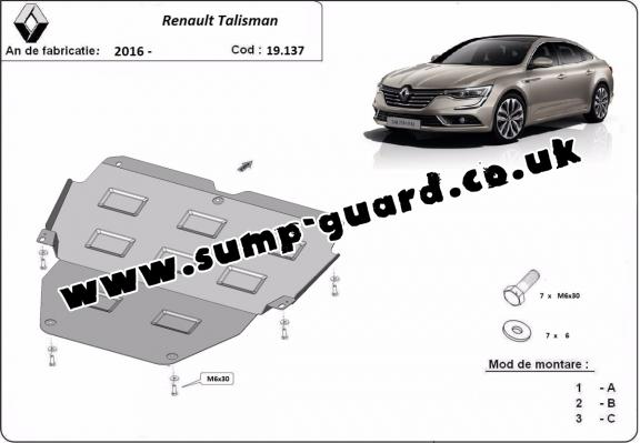 The sump guard is new and fits perfectly for all versions of Renault Talisman manufactured between 2016 and 2022. Sump guard for the protection of the: engine, gearbox Made out of 2 mm thick Steel plate. Screws, nuts, clips, all fastening accessories are included. All sump guards are powder coated to prevent corrosion. The exterior of the sump guard is provided with Steel reinforcements, which increases the resistance to impact. |