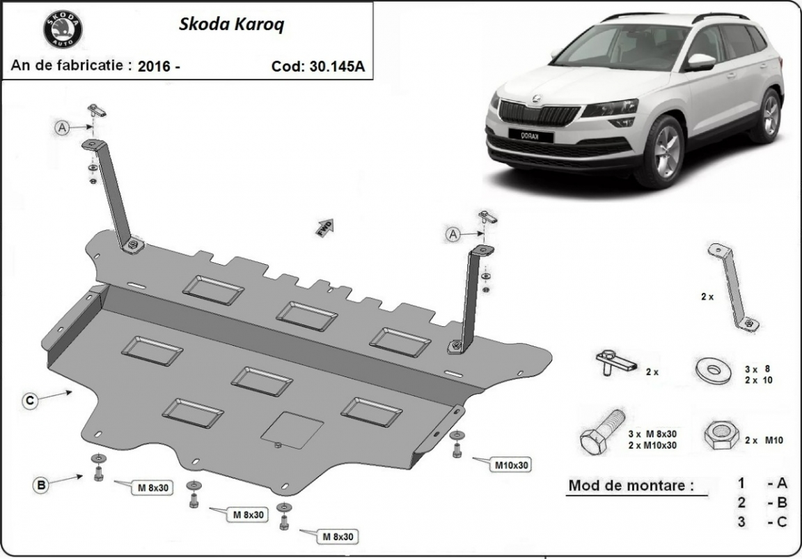The sump guard is new and fits perfectly for all versions of Skoda Karoq manufactured between 2016 and 2026. Sump guard for the protection of the: engine, gearbox, radiator, front bumper Made out of 2 mm thick Steel plate. Screws, nuts, clips, all fastening accessories are included. All sump guards are powder coated to prevent corrosion. The exterior of the sump guard is provided with Steel reinforcements, which increases the resistance to impact. |