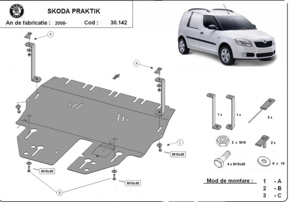 The sump guard is new and fits perfectly for all versions of Skoda Praktik manufactured between 2006 and 2015. Sump guard for the protection of the: engine, gearbox, radiator, front bumper It has an opening for the oil sump, so it's removal won't be necessary to change the oil. Made out of 2 mm thick Steel plate. Screws, nuts, clips, all fastening accessories are included. All sump guards are powder coated to prevent corrosion. The exterior of the sump guard is provided with Steel reinforcements, which increases the resistance to impact. |
