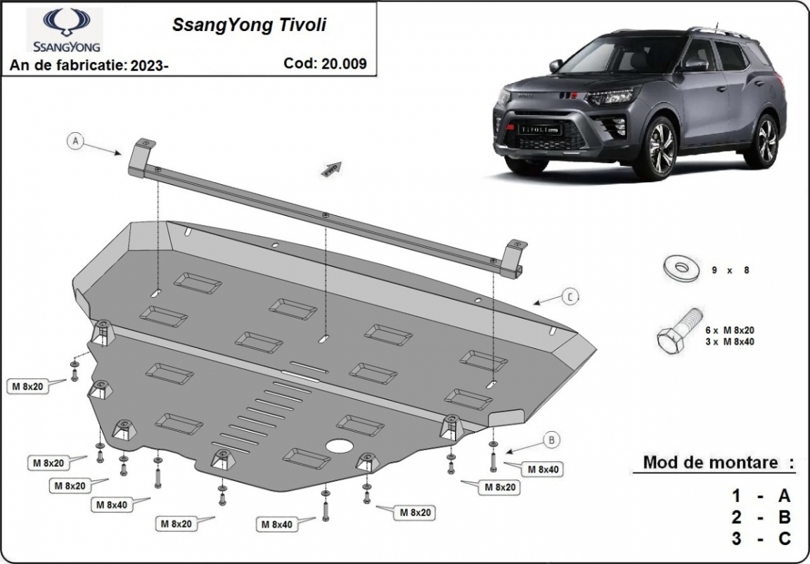 The sump guard is new and fits perfectly for all versions of SsangYong Tivoli manufactured between 2023 and 2026. Sump guard for the protection of the: engine, gearbox, radiator Made out of 2 mm thick Steel plate. Screws, nuts, clips, all fastening accessories are included. All sump guards are powder coated to prevent corrosion. The exterior of the sump guard is provided with Steel reinforcements, which increases the resistance to impact. |