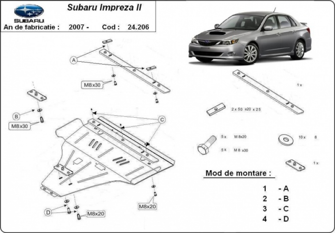 The sump guard is new and fits perfectly for the Subaru Impreza, with the following engine/drive versions: essence - manufactured between 2007 and 2016. Sump guard for the protection of the: engine, gearbox Made out of 2 mm thick Steel plate. Screws, nuts, clips, all fastening accessories are included. All sump guards are powder coated to prevent corrosion. The exterior of the sump guard is provided with Steel reinforcements, which increases the resistance to impact. |