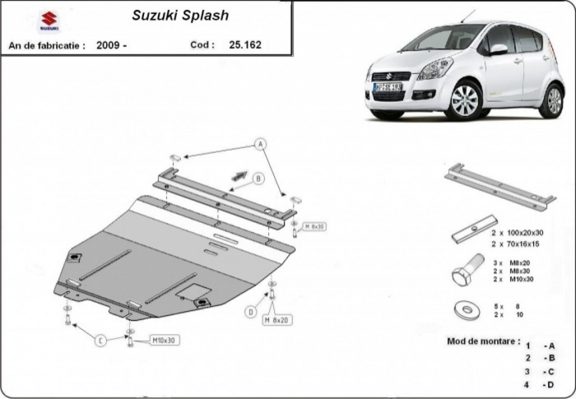 The sump guard is new and fits perfectly for all versions of Suzuki Splash an manufactured between 2009 and 2016. Sump guard for the protection of the: engine, gearbox It has an opening for the oil sump, so it's removal won't be necessary to change the oil. Made out of 2 mm thick Steel plate. Screws, nuts, clips, all fastening accessories are included. All sump guards are powder coated to prevent corrosion. The exterior of the sump guard is provided with Steel reinforcements, which increases the resistance to impact. |