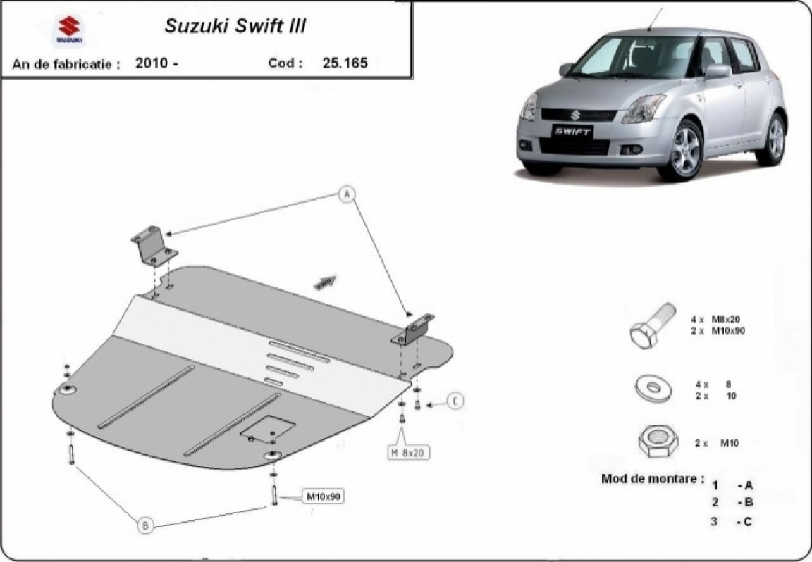 The sump guard is new and fits perfectly for all versions of Suzuki Swift 3 manufactured between 2010 and 2017. Sump guard for the protection of the: engine, gearbox It has an opening for the oil sump, so it's removal won't be necessary to change the oil. Made out of 2 mm thick Steel plate. Screws, nuts, clips, all fastening accessories are included. All sump guards are powder coated to prevent corrosion. The exterior of the sump guard is provided with Steel reinforcements, which increases the resistance to impact. |