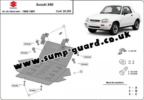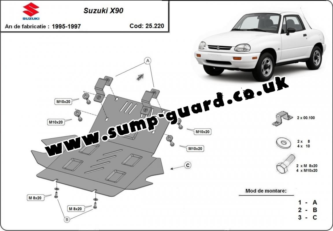 The sump guard is new and fits perfectly for all versions of Suzuki X90 manufactured between 1988 and 1999. Sump guard for the protection of the: engine, radiator Made out of 3 mm thick Steel plate. Screws, nuts, clips, all fastening accessories are included. All sump guards are powder coated to prevent corrosion. The exterior of the sump guard is provided with Steel reinforcements, which increases the resistance to impact. |