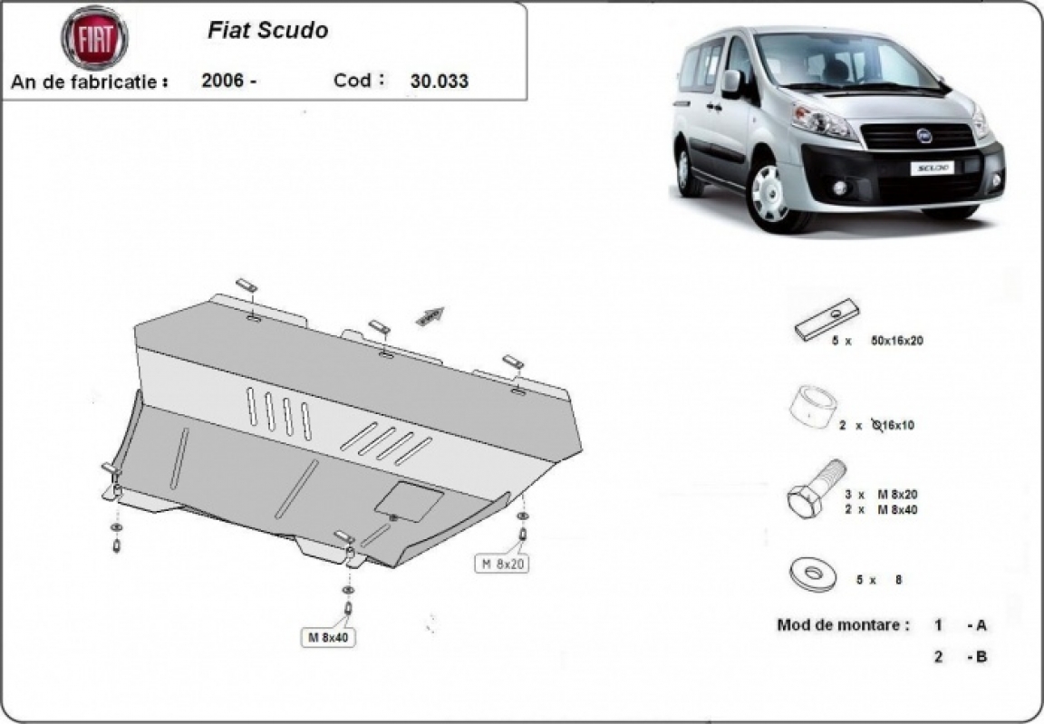 The sump guard is new and fits perfectly for all versions of Fiat Scudo manufactured between 2006 and 2016. Sump guard for the protection of the: engine, gearbox, radiator It has an opening for the oil sump, so it's removal won't be necessary to change the oil. Made out of 2 mm thick Steel plate. Screws, nuts, clips, all fastening accessories are included. All sump guards are powder coated to prevent corrosion. The exterior of the sump guard is provided with Steel reinforcements, which increases the resistance to impact. |