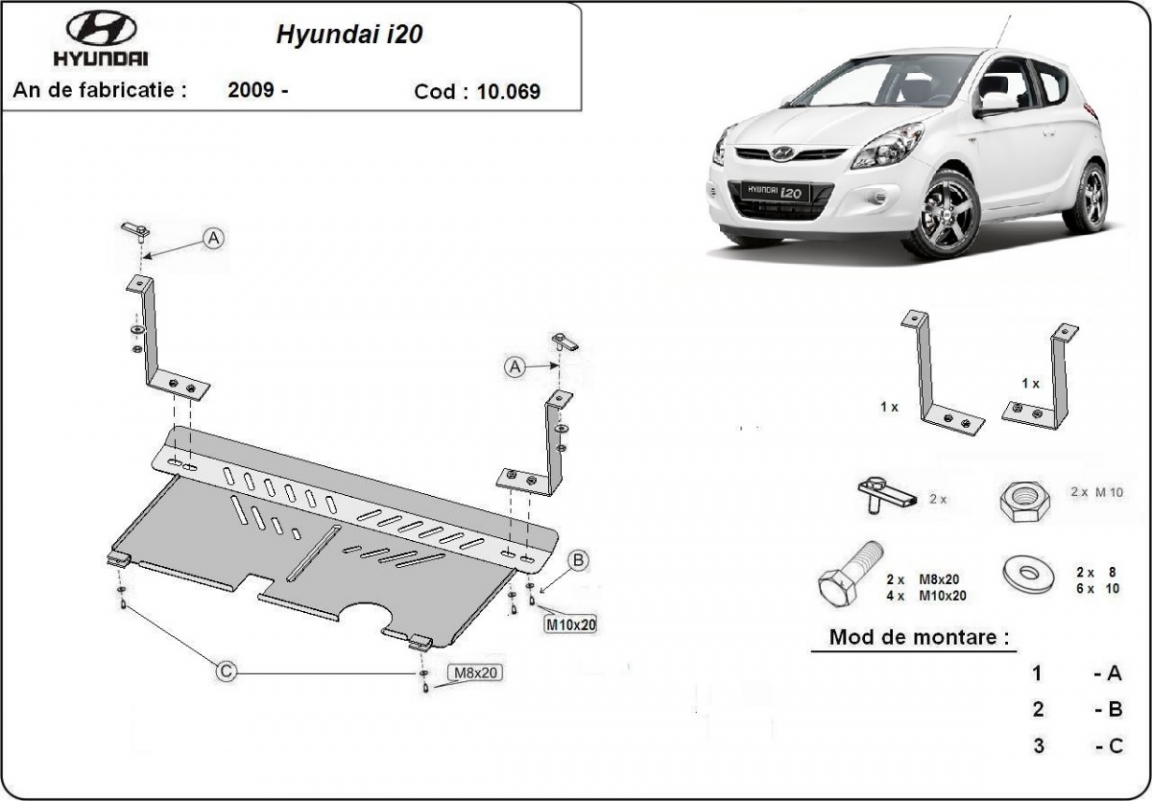 The sump guard is new and fits perfectly for all versions of Hyundai i 20 manufactured between 2009 and 2014. Sump guard for the protection of the: engine, gearbox, radiator Made out of 2 mm thick Steel plate. Screws, nuts, clips, all fastening accessories are included. All sump guards are powder coated to prevent corrosion. The exterior of the sump guard is provided with Steel reinforcements, which increases the resistance to impact. |