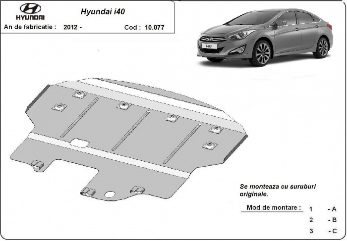 The sump guard is new and fits perfectly for all versions of Hyundai i40 manufactured between 2011 and 2015. Sump guard for the protection of the: engine, gearbox Made out of 2 mm thick Steel plate. Screws, nuts, clips, all fastening accessories are included. All sump guards are powder coated to prevent corrosion. The exterior of the sump guard is provided with Steel reinforcements, which increases the resistance to impact. |