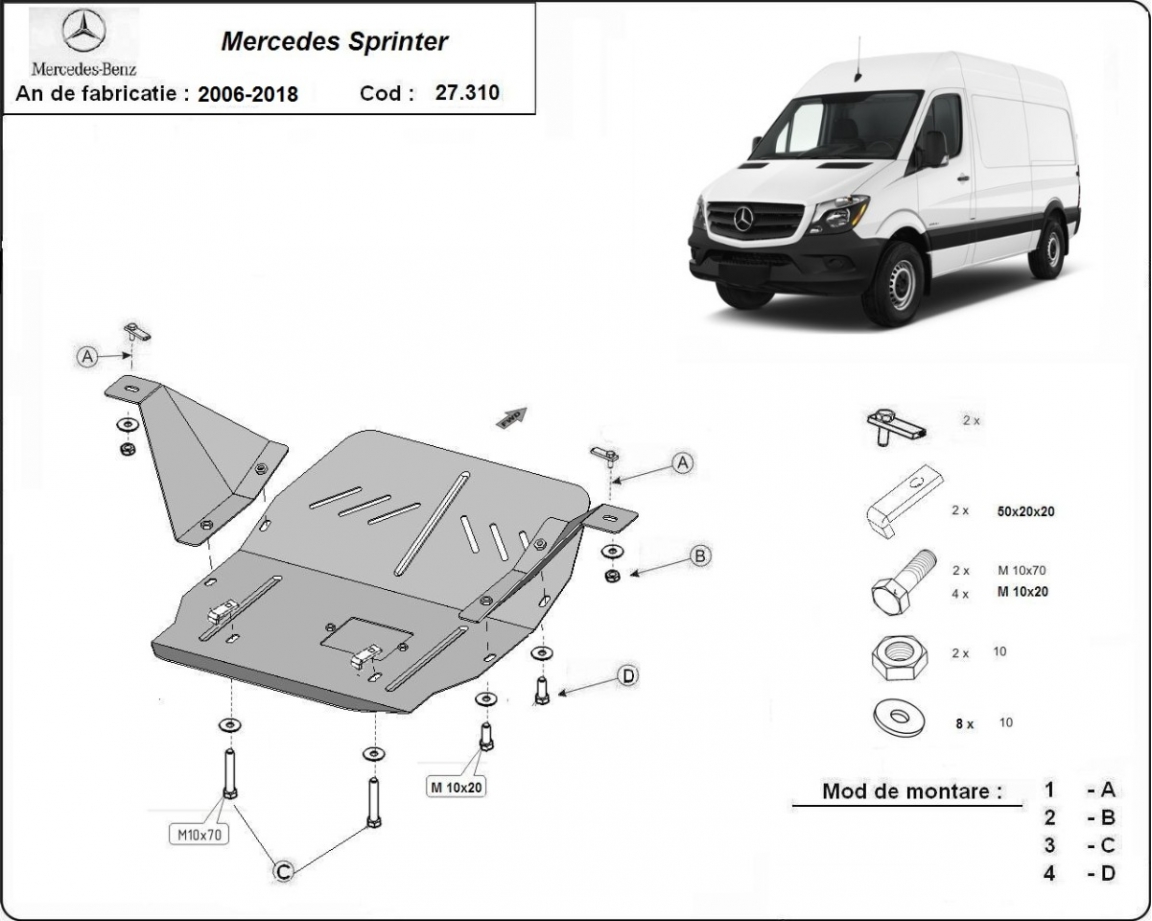 The sump guard is new and fits perfectly for all versions of Mercedes Sprinter manufactured between 2006 and 2018. Sump guard for the protection of the: engine, gearbox It has an opening for the oil sump, so it's removal won't be necessary to change the oil. Made out of 3 mm thick Steel plate. Screws, nuts, clips, all fastening accessories are included. All sump guards are powder coated to prevent corrosion. The exterior of the sump guard is provided with Steel reinforcements, which increases the resistance to impact. |