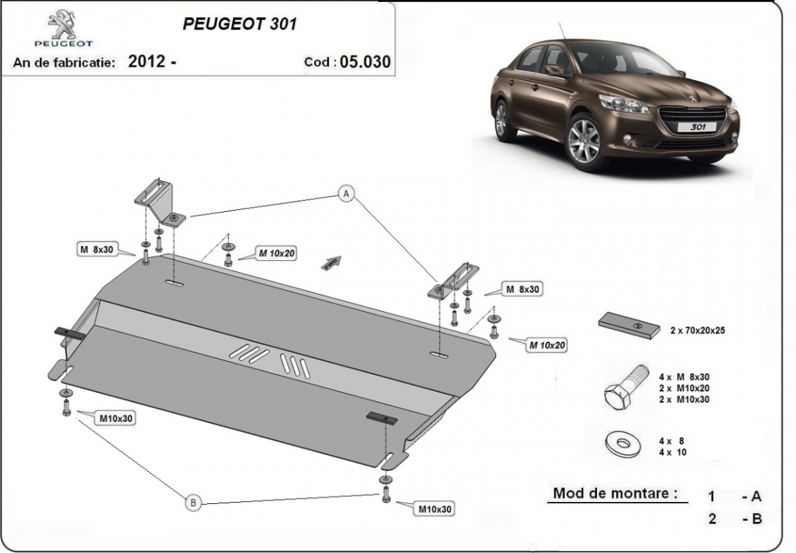 The sump guard is new and fits perfectly for all versions of Peugeot 301 manufactured between 2012 and 2026. Sump guard for the protection of the: engine, gearbox Made out of 2 mm thick Steel plate. Screws, nuts, clips, all fastening accessories are included. All sump guards are powder coated to prevent corrosion. The exterior of the sump guard is provided with Steel reinforcements, which increases the resistance to impact. |