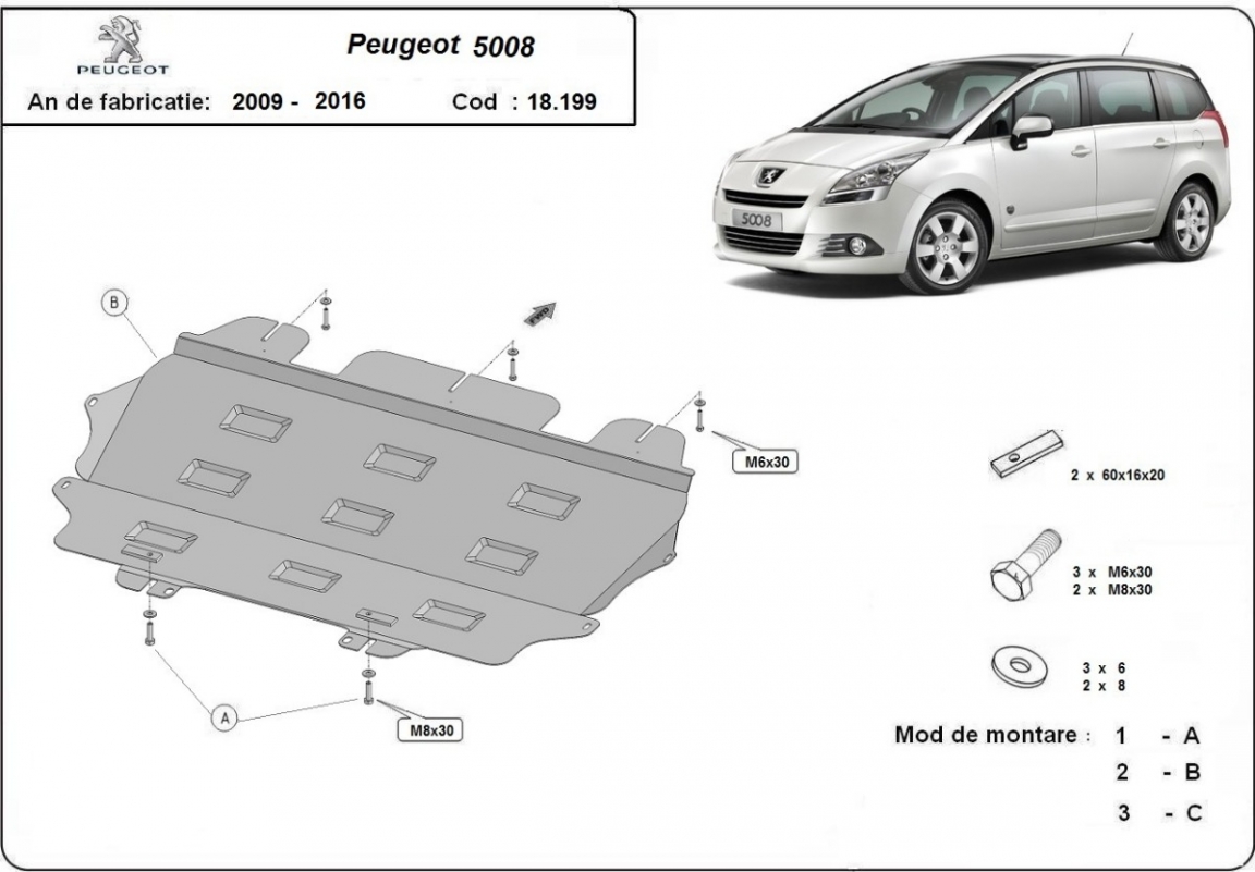 The sump guard is new and fits perfectly for all versions of Peugeot 5008 manufactured between 2009 and 2017. Sump guard for the protection of the: engine, gearbox Made out of 2 mm thick Steel plate. Screws, nuts, clips, all fastening accessories are included. All sump guards are powder coated to prevent corrosion. The exterior of the sump guard is provided with Steel reinforcements, which increases the resistance to impact. |