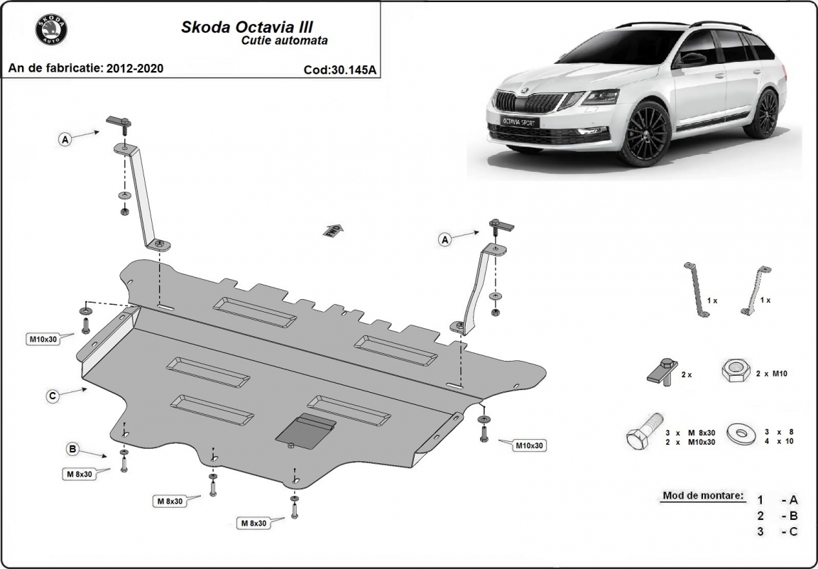 Steel sump guard for the protection of the engine and the gearbox for Skoda Octavia 3 - automatic gearbox (2013-2019)