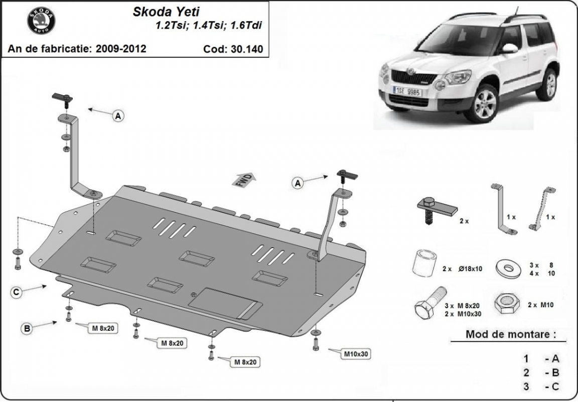 The sump guard is new and fits perfectly for the Skoda Yeti, with the following engine/drive versions: 1.2,1.4,TSI, 1.8 , 1.6TDI, 2.0TDI,1.8TSI - manufactured between 2009 and 2012. Sump guard for the protection of the: engine, gearbox, radiator It has an opening for the oil sump, so it's removal won't be necessary to change the oil. Made out of 2 mm thick Steel plate. Screws, nuts, clips, all fastening accessories are included. All sump guards are powder coated to prevent corrosion. The exterior of the sump guard is provided with Steel reinforcements, which increases the resistance to impact. |