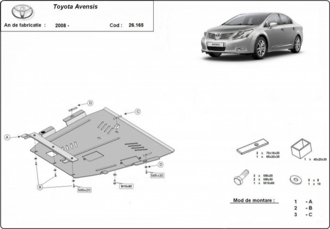 The sump guard is new and fits perfectly for all versions of Toyota Avensis manufactured between 2008 and 2018. Sump guard for the protection of the: engine It has an opening for the oil sump, so it's removal won't be necessary to change the oil. Made out of 2 mm thick Steel plate. Screws, nuts, clips, all fastening accessories are included. All sump guards are powder coated to prevent corrosion. The exterior of the sump guard is provided with Steel reinforcements, which increases the resistance to impact. |