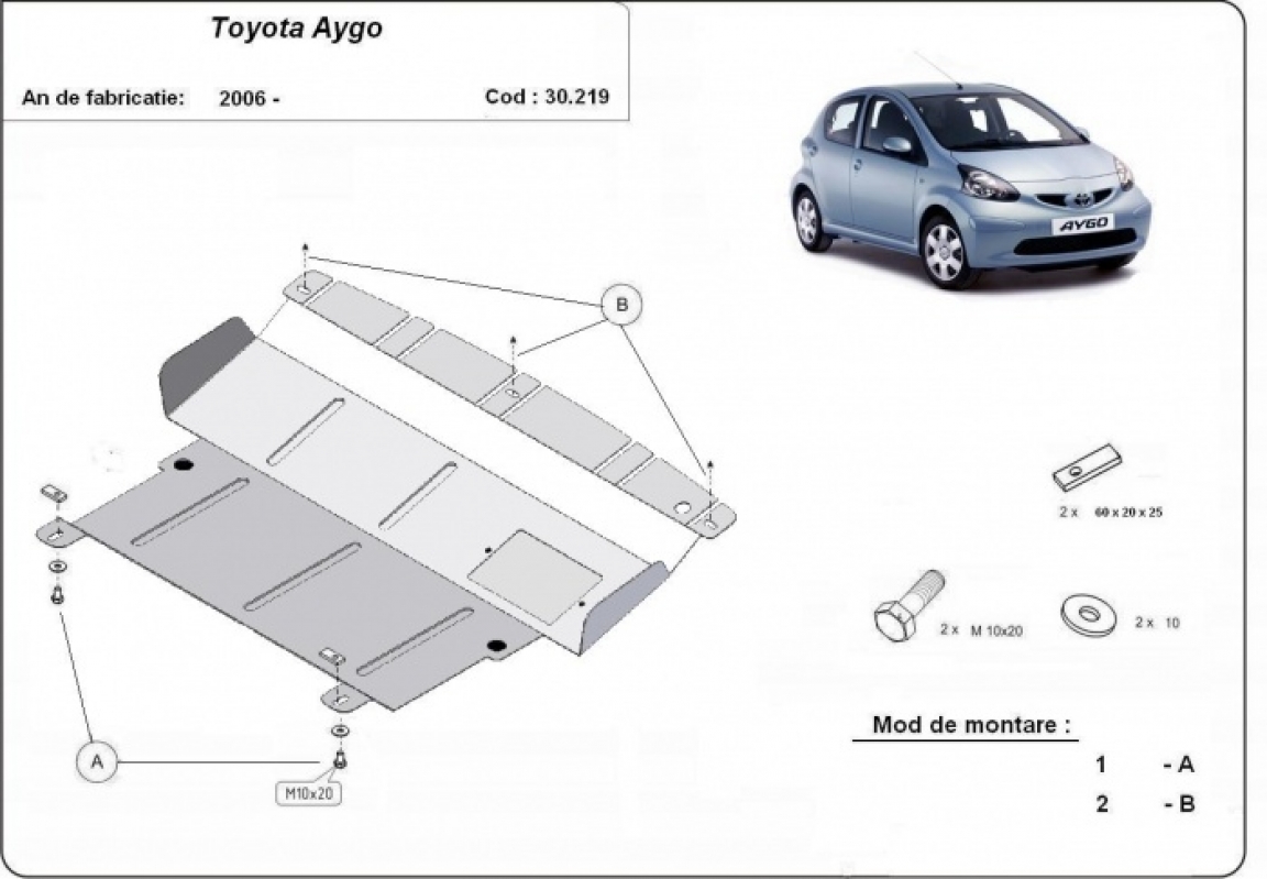 The sump guard is new and fits perfectly for all versions of Toyota Aygo AB10 manufactured between 2005 and 2014. Sump guard for the protection of the: engine, gearbox, radiator, front bumper It has an opening for the oil sump, so it's removal won't be necessary to change the oil. Made out of 2 mm thick Steel plate. Screws, nuts, clips, all fastening accessories are included. All sump guards are powder coated to prevent corrosion. The exterior of the sump guard is provided with Steel reinforcements, which increases the resistance to impact. |