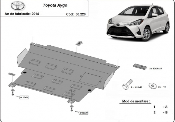 The sump guard is new and fits perfectly for all versions of Toyota Aygo AB40 manufactured between 2014 and 2022. Sump guard for the protection of the: engine, gearbox, radiator It has an opening for the oil sump, so it's removal won't be necessary to change the oil. Made out of 2 mm thick Steel plate. Screws, nuts, clips, all fastening accessories are included. All sump guards are powder coated to prevent corrosion. The exterior of the sump guard is provided with Steel reinforcements, which increases the resistance to impact. |