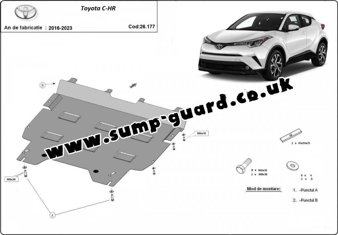 The sump guard is new and fits perfectly for all versions of Toyota C-HR manufactured between 2016 and 2023. Sump guard for the protection of the: engine, gearbox, radiator Made out of 2 mm thick Steel plate. Screws, nuts, clips, all fastening accessories are included. All sump guards are powder coated to prevent corrosion. The exterior of the sump guard is provided with Steel reinforcements, which increases the resistance to impact. |