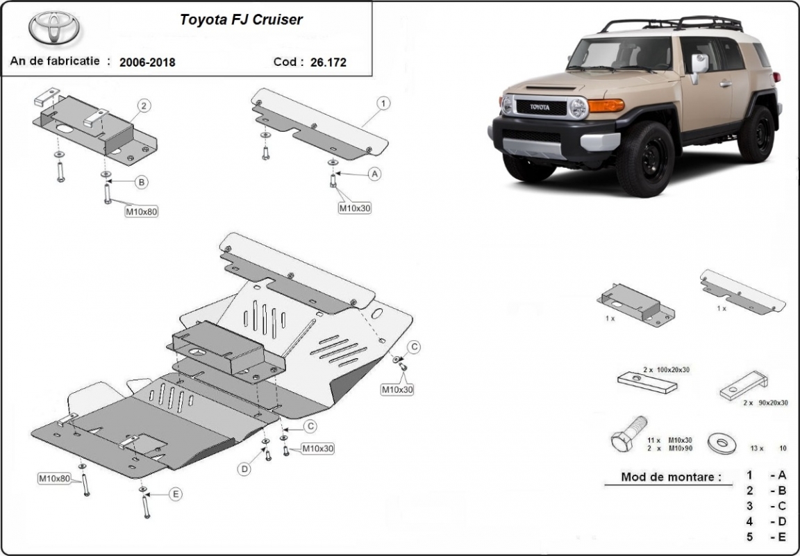The sump guard is new and fits perfectly for all versions of Toyota Fj Cruiser manufactured between 2006 and 2018. Sump guard for the protection of the: engine, radiator, front bumper Made out of 2.5 mm thick Steel plate. Screws, nuts, clips, all fastening accessories are included. All sump guards are powder coated to prevent corrosion. The exterior of the sump guard is provided with Steel reinforcements, which increases the resistance to impact. |