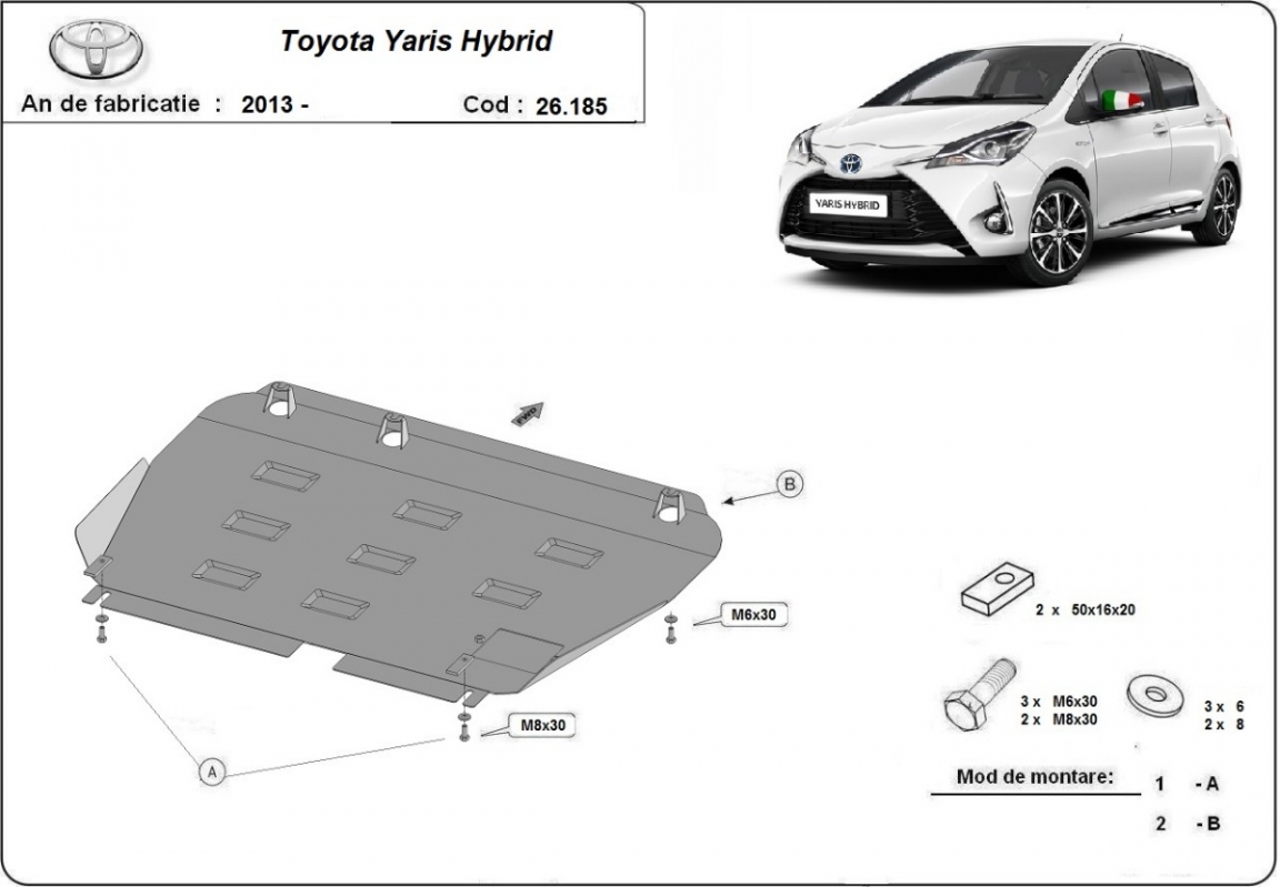 The sump guard is new and fits perfectly for the Toyota Yaris Hybrid, with the following engine/drive versions: XP150, all, Hybrid - manufactured between 2013 and 2021. Sump guard for the protection of the: engine, gearbox, radiator Made out of 2 mm thick Steel plate. Screws, nuts, clips, all fastening accessories are included. All sump guards are powder coated to prevent corrosion. The exterior of the sump guard is provided with Steel reinforcements, which increases the resistance to impact. |