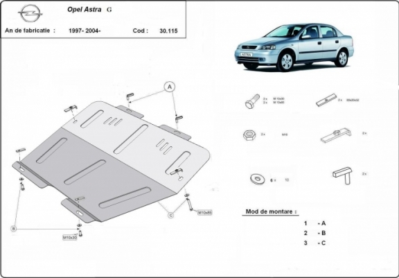 The sump guard is new and fits perfectly for the Vauxhall Astra G, with the following engine/drive versions: 1.4-2.0 - manufactured between 1997 and 2004. Sump guard for the protection of the: engine, gearbox, radiator Made out of 2 mm thick Steel plate. Screws, nuts, clips, all fastening accessories are included. All sump guards are powder coated to prevent corrosion. The exterior of the sump guard is provided with Steel reinforcements, which increases the resistance to impact. |