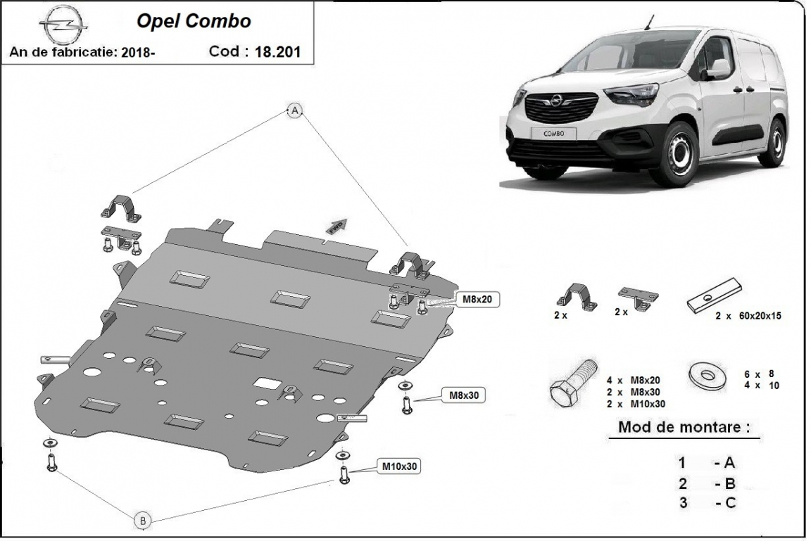 The sump guard is new and fits perfectly for all versions of Vauxhall Combo manufactured between 2018 and 2026. Sump guard for the protection of the: engine, gearbox, radiator, front bumper Made out of 2 mm thick Steel plate. Screws, nuts, clips, all fastening accessories are included. All sump guards are powder coated to prevent corrosion. The exterior of the sump guard is provided with Steel reinforcements, which increases the resistance to impact. |