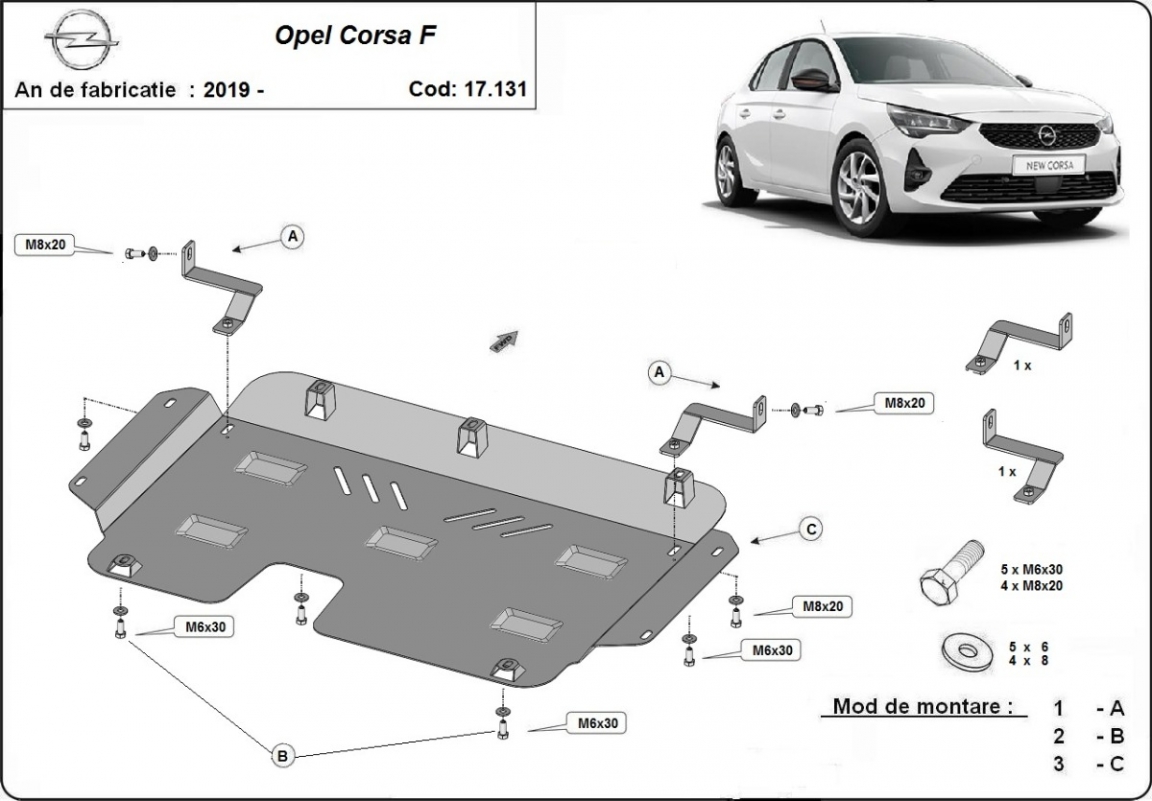 The sump guard is new and fits perfectly for all versions of Opel Corsa F manufactured between 2019 and 2026. Sump guard for the protection of the: engine, gearbox, radiator Made out of 2 mm thick Steel plate. Screws, nuts, clips, all fastening accessories are included. All sump guards are powder coated to prevent corrosion. The exterior of the sump guard is provided with Steel reinforcements, which increases the resistance to impact. |