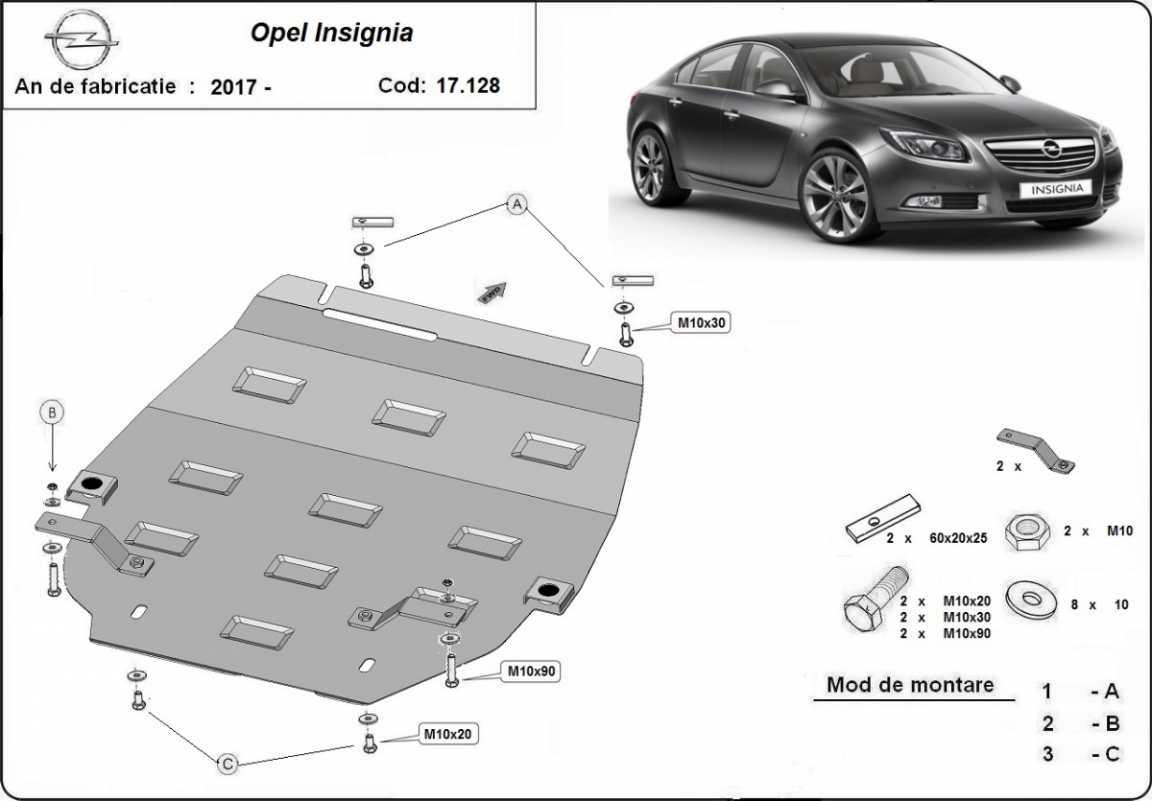 The sump guard is new and fits perfectly for all versions of Vauxhall Insignia manufactured between 2017 and 2026. Sump guard for the protection of the: engine, gearbox, radiator Made out of 2 mm thick Steel plate. Screws, nuts, clips, all fastening accessories are included. All sump guards are powder coated to prevent corrosion. The exterior of the sump guard is provided with Steel reinforcements, which increases the resistance to impact. |