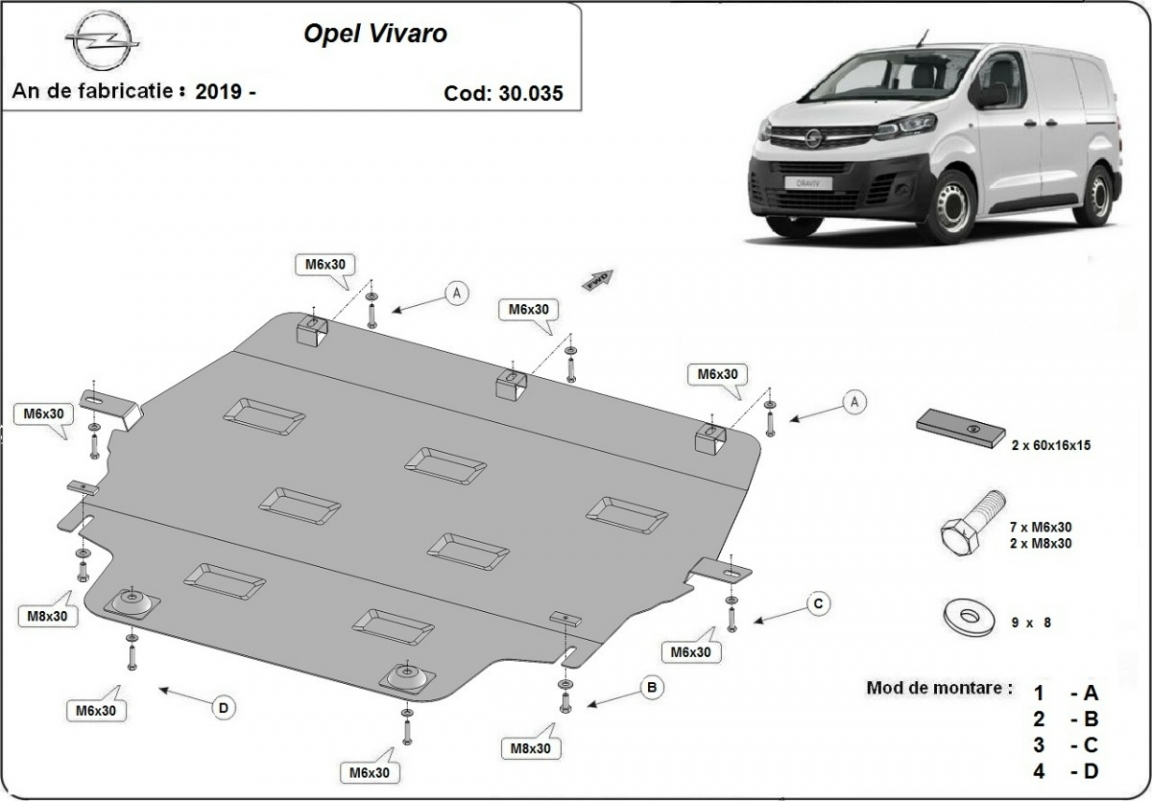 The sump guard is new and fits perfectly for all versions of Vauxhall Vivaro manufactured between 2019 and 2026. Sump guard for the protection of the: engine, gearbox, radiator Made out of 2 mm thick Steel plate. Screws, nuts, clips, all fastening accessories are included. All sump guards are powder coated to prevent corrosion. The exterior of the sump guard is provided with Steel reinforcements, which increases the resistance to impact. |