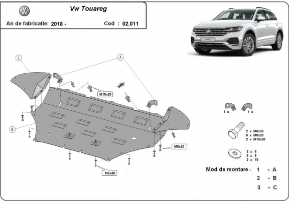 The sump guard is new and fits perfectly for all versions of Volkswagen Touareg manufactured between 2018 and 2026. Sump guard for the protection of the: engine, radiator, front bumper Made out of 2 mm thick Steel plate. Screws, nuts, clips, all fastening accessories are included. All sump guards are powder coated to prevent corrosion. The exterior of the sump guard is provided with Steel reinforcements, which increases the resistance to impact. |