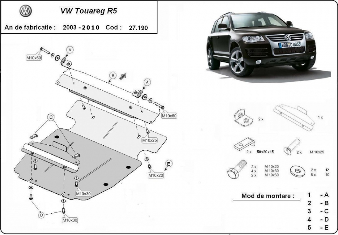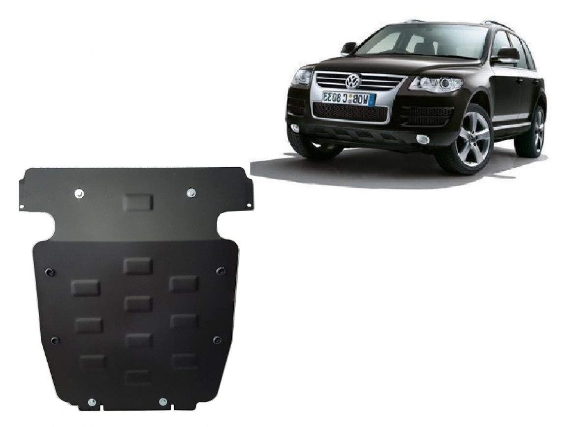 The sump guard is new and fits perfectly for all versions of Volkswagen Touareg 7L manufactured between 2003 and 2010. Sump guard for the protection of the: engine Made out of 3 mm thick Steel plate. Screws, nuts, clips, all fastening accessories are included. All sump guards are powder coated to prevent corrosion. The exterior of the sump guard is provided with Steel reinforcements, which increases the resistance to impact. |