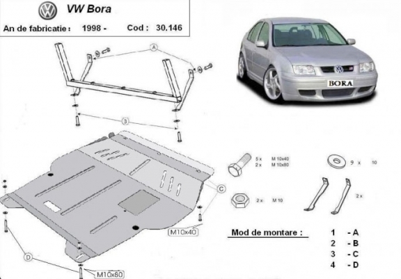The sump guard is new and fits perfectly for all versions of VW Bora manufactured between 1998 and 2006. Sump guard for the protection of the: engine, gearbox, radiator, front bumper It has an opening for the oil sump, so it's removal won't be necessary to change the oil. Made out of 2 mm thick Steel plate. Screws, nuts, clips, all fastening accessories are included. All sump guards are powder coated to prevent corrosion. The exterior of the sump guard is provided with Steel reinforcements, which increases the resistance to impact. |