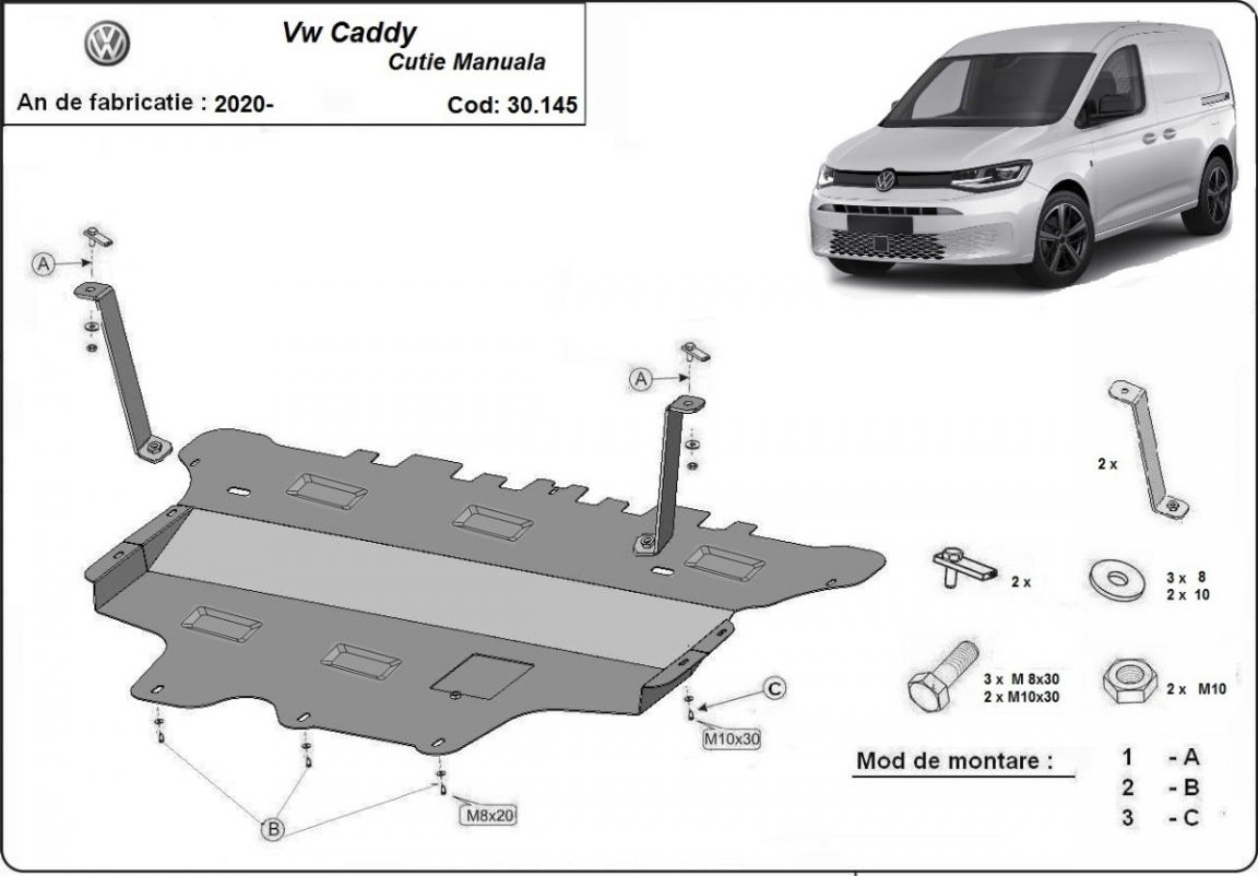 The sump guard is new and fits perfectly for all versions of VW Caddy manufactured between 2020 and 2026. Sump guard for the protection of the: engine, gearbox, radiator, front bumper Made out of 2 mm thick Steel plate. Screws, nuts, clips, all fastening accessories are included. All sump guards are powder coated to prevent corrosion. The exterior of the sump guard is provided with Steel reinforcements, which increases the resistance to impact. |