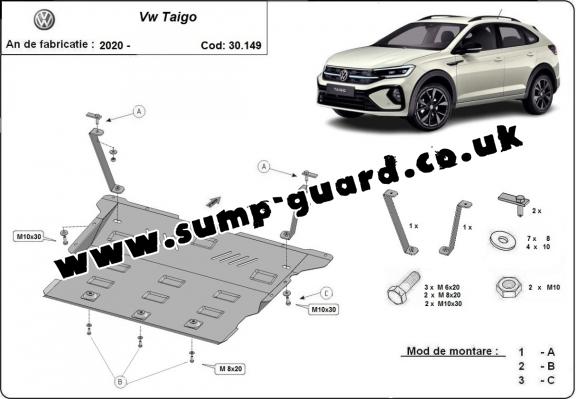 The sump guard is new and fits perfectly for all versions of VW Taigo manufactured between 2020 and 2025. Sump guard for the protection of the: engine, gearbox, radiator, front bumper Made out of 2 mm thick Steel plate. Screws, nuts, clips, all fastening accessories are included. All sump guards are powder coated to prevent corrosion. The exterior of the sump guard is provided with Steel reinforcements, which increases the resistance to impact. |