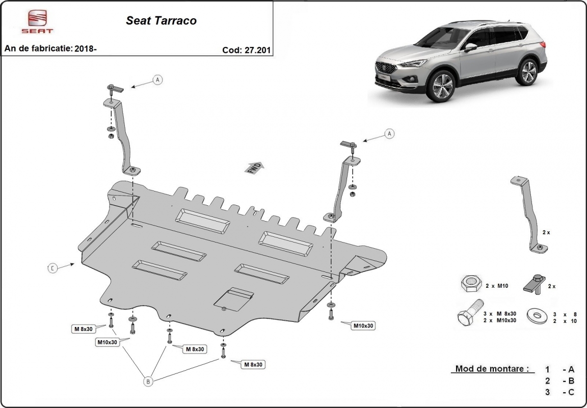 The sump guard is new and fits perfectly for all versions of Seat Tarraco manufactured between 2018 and 2026. Sump guard for the protection of the: engine, gearbox, radiator It has an opening for the oil sump, so it's removal won't be necessary to change the oil. Made out of 2 mm thick Steel plate. Screws, nuts, clips, all fastening accessories are included. All sump guards are powder coated to prevent corrosion. The exterior of the sump guard is provided with Steel reinforcements, which increases the resistance to impact. |