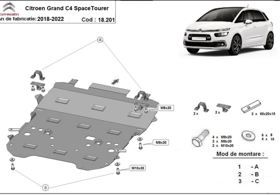 The sump guard is new and fits perfectly for all versions of Citroen Grand C4 SpaceTourer manufactured between 2018 and 2020. Sump guard for the protection of the: engine, gearbox, radiator, front bumper, subframe Made out of 2 mm thick Steel plate. Screws, nuts, clips, all fastening accessories are included. All sump guards are powder coated to prevent corrosion. The exterior of the sump guard is provided with Steel reinforcements, which increases the resistance to impact. |